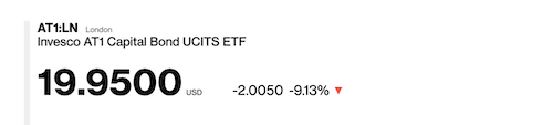 截至北京时间周一17:40, 景顺AT1资本债券ETF(Invesco AT1 Capital Bond UCITS ETF)大跌13.61%。到20:00时,跌幅收窄至9.13%。