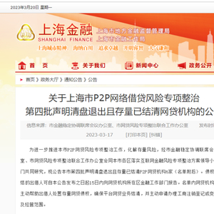 金融虎讯 3月20日消息,近期,上海地方金融监督管理局发布了《关于上海市P2P网络借贷风险专项整治第四批声明清盘退出且存量已结清网贷机构的公告》,公布了辖区内第四批声明清盘退出且存量已结清P2P网贷机构6家。