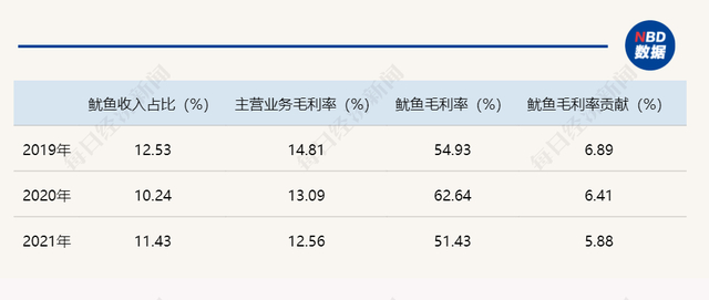 记者注意到,也正是这些自捕鱿鱼成了大洋世家盈利的关键——2019年~2021年,大洋世家主营业务毛利率分别是14.81%、13.09%、以及12.56%,其中,营收占比在10%左右的鱿鱼,分别贡献了其中的6.89%、6.41%以及5.88%。