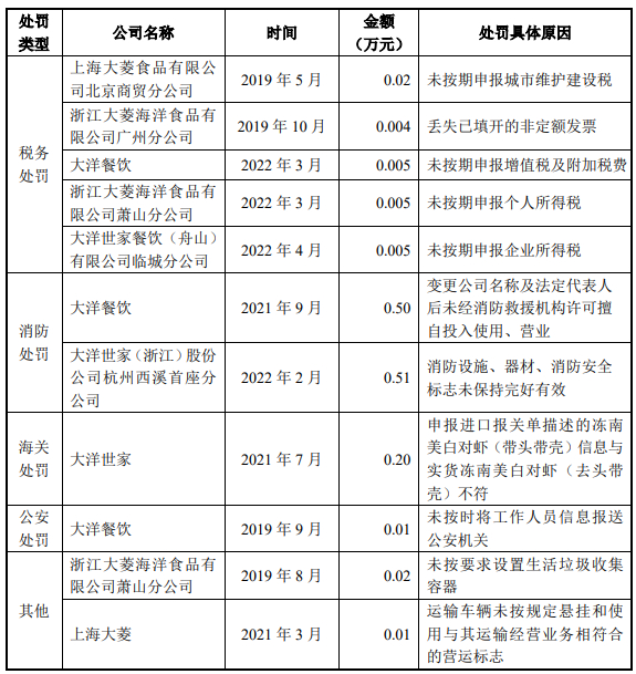 据大洋世家招股书,报告期内,公司及子公司曾受到3次1万元以上(含1万元)的处罚,具体情况如下: