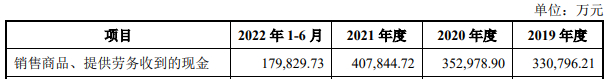 2019年-2021年及2022年1-6月,大洋世家营业收入分别为315,831.59万元、327,975.61万元、393,865.29万元、183,507.04万元,销售商品、提供劳务收到的现金分别为330,796.21万元、352,978.90万元、407,844.72万元、179,829.73万元。