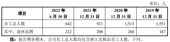 2019年末、2020年末、2021年末、2022年6月末,大洋世家员工总人数分别为1,551人、1,513人、921人、642人,其中退休返聘187人、268人、208人、222人。
