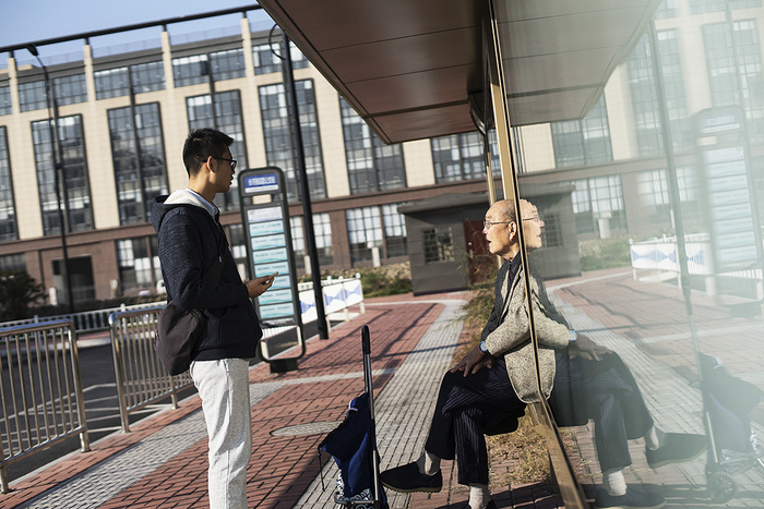2018年10月27日,杭州,早八点,杨云海在养老院门口等公交,去往20分钟车程外的培训机构上课。阳光家园位于杭州滨江高新技术开发区,是由区政府投资“公建民营”的养老院。从2017年年中开始,滨江团区委和区民政局共同推出项目“陪伴是最长情告白”——以低价出租闲置床位,吸引年轻人入住。年轻人每月只需交纳300元管理费。与此同时,每月需提供20小时以上的志愿服务。在该地段,一室一厅的出租房月租1500左右。一群老年人和几个年轻人就这样生活在一起。