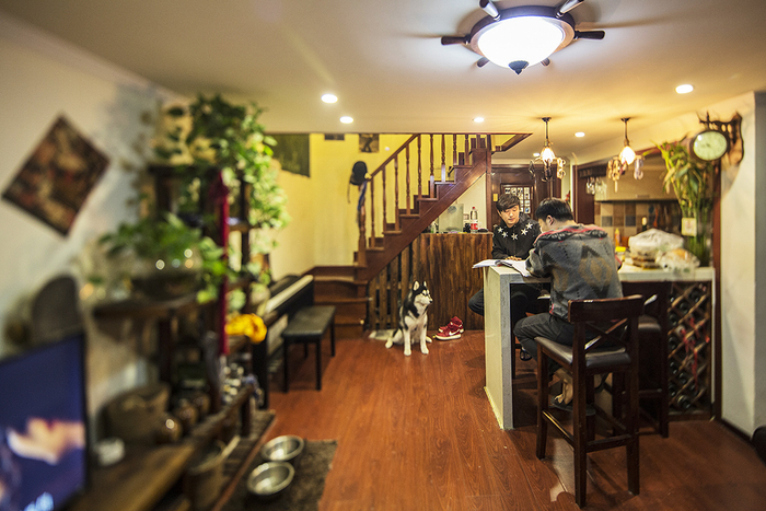 2017年11月8日,北京像素小区,东庭和大龙在家中讨论剧本,两个人在北京一家影视公司做导演,东庭在像素住了两年,房子是朋友的。半年前东庭从通州搬了过来,考虑到这里交通方便、loft房间结构比较适合年轻人居住。平时东庭在外面拍片,没事儿的时候就在家里呆着。东庭曾想过在这里买房定居,无奈房价飙涨,目前像素的房子由于318新政房价回落,但又只能全款购买,虽然很喜欢这里,但还是只能在别的地方考虑。朝阳区与通州区交界处的这片北京商住楼盘,有9000多套房屋,居住着三万多人,单位面积内分布着最多的年轻“北漂”。每天早晚上下班高峰,成群结队的“北漂”集体完成从“北京像素”往返市区的迁徙。(图片来源:腾讯新闻谷雨实验室 赵赫廷)
