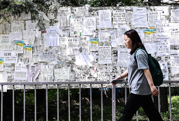 2021年8月18日,在沈阳一高校内广告栏旁,暑假留沈的大学生们在密密麻麻的租房信息旁经过。