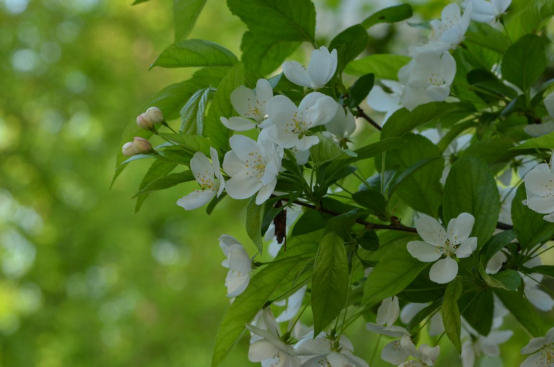 山荆子花朵稍下垂,花色白色,花柄较长,通常为绿色,可以作为识别要点,山荆子抗寒能力强,常作为海棠嫁接的砧木。