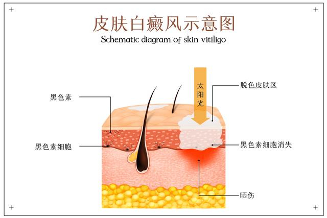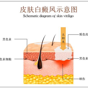 6、白癜风:又称白驳风,是后天性局限性皮肤色素脱失症,患者常无自觉症状。黑素细胞可产生黑色素,而黑色素可赋予皮肤、头发和眼睛颜色。若黑素细胞死亡或停止产生黑色素,则可导致色素脱失,引起白癜风的发生。