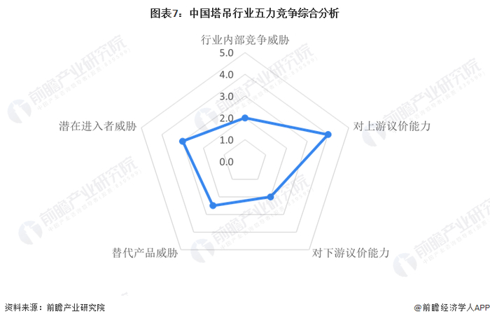从波特五力竞争模型的角度分析,目前,塔吊行业代表性企业毛利率普遍较高,行业吸引力大,但行业为技术密集型行业,进入该行业具有很高的技术壁垒,因此受到一定的技术制约;我国塔吊行业现有竞争者数量不多,市场集中度较低,行业内部竞争威胁较小;上游供应商一般为钢材、减速机、电动机等大宗产品,企业较多且产品同质化严重,因此塔吊行业议价能力较强;下游客户群体分散,且主要为民生类的刚需产业,对塔吊需求量较大且稳定,因此塔吊行业对下游客户的议价能力较弱;随着其他辅助机械的技术改进,潜在进入者威胁有所增强。