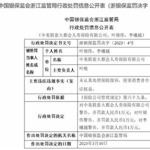 中国经济网北京3月21日讯 银保监会网站今日发布行政处罚信息公开表(浙银保监罚决字〔2023〕4号),中美联泰大都会人寿保险有限公司存在未认真处理保险投诉,侵害消费者合法权益的违法违规事实,银保监会浙江监管局对其警告,并罚款人民币1万元;对叶锦伟警告,并罚款人民币1万元;对李曦越警告,并罚款人民币1万元。行政处罚依据为《保险公司管理规定》第六十九条。