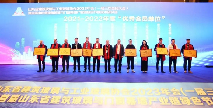 山东省玻璃协会法人代表林成伦常务副会长、吕庆波监事长为“2021-2022年度优秀会员单位”颁发了荣誉授牌。