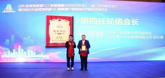 本届轮值会长由山东泰山华岳玻璃有限公司总经理张序峰担任,临沂中玻鹏昊玻璃有限公司刘浩总做述职报告,并进行现场交接仪式,并做就职讲话。