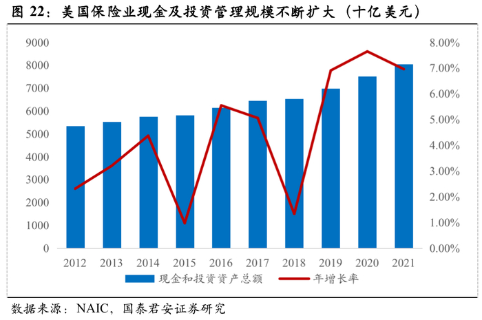 美国保险资管AUM持续提升,是管理费增长是主要驱动因素。截至2021年末,美国保险业的现金及投资管理规模合计8.05万亿美元,2012-2021年管理资产规模的年复合增速4.17%,成为美国保险资管管理费增长的主要驱动因素。