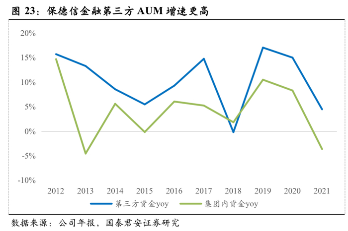 第三方资金增长是驱动AUM的主要动能。随着美国寿险保费增速趋势放缓,第三方资金增长成为驱动AUM的主要动能。以保德信金融PGIM为例,2012-2021年,第三方资管规模年复合增长率达8.58%,高于集团内保险资金增速2.78%,推动了整体AUM的稳健增长。
