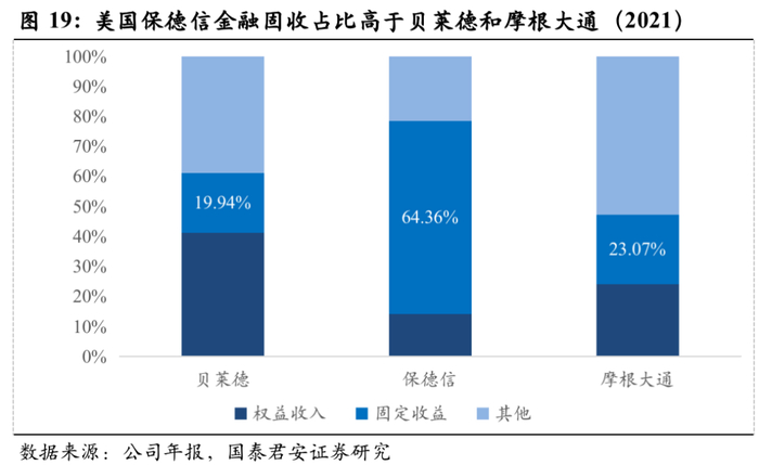 成熟的固收资产投资能力是核心优势,利好满足客户长期稳健的投资回报需求。美国保险资管公司最核心的竞争力在于提供满足客户需求的长久期、以固定收益资产为主的产品。在ACLI发布的2021年年度数据中,美国保险行业整体偏好的投资资产以债券类型为主,占比达到61.4%,考虑到保险公司负债端长久期的特点,通过配置固收资产有利于拉长资产久期,从而实现资产负债匹配管理。保险资管机构相比于独立系资管和银行系资管机构,对固收类资产的配置偏好更高。保德信金融的固收类产品占比达到了64.4%,而独立系资管机构代表贝莱德和银行系资管机构代表摩根大通的固收类资产占比仅为19.9%和23.1%。