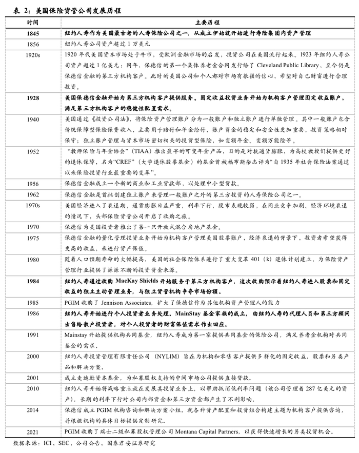 美国保险资管行业伴随保险公司的成立而兴起,客群和产品日益丰富。1845年伴随着纽约人寿的成立,其便开始对集团内的保险资金进行资产管理,最初仅为一个资产管理部,这是美国保险资管行业最初的商业模式。1928年,保德信金融开始面向机构客户管理固收账户,满足机构客户的稳健投资需求。1940年美国首次通过《投资公司法》,将保险资产管理账户分为一般账户和独立账户进行单独管理。1962年,保德信金融成为首批创建独立账户,以管理一般账户之外的第三方投资的人寿保险公司之一,满足机构的财富管理需求。1970s美国经济进入了衰退期,通货膨胀日益严重,利率下行,股市表现较弱,在同业竞争加剧、经济环境衰退的情况下,头部保险资管公司开启了收购之旅。1980年代,随着人口预期寿命的大幅提高,美国的社会保险体系进行了重大变革,401(K)退休计划建立,为保险资管行业的发展注入了源源不断的新活力。1984年,纽约人寿收购MacKay Shields预示着进入股票和固定收益的独立主动管理业务,MainStay基金家族的成立,由纽约人寿的代理人和第三方投资顾问销售给散户投资者,满足其财富管理需求。养老金计划的推行,使得保险资管公司看到了更大的机遇,为满足养老金客户对共同基金产品的需求,Mainstay 在1991年开始提供机构共同基金,纽约人寿成为第一家提供共同基金的保险公司,在同业保险资产管理公司中保持竞争优势。在长期低利率环境的影响下,固收资产收益率也不断下跌,美国保险资管机构进行不断地并购,利用独立系资产管理公司来弥补权益类、另类资产方面的短缺。