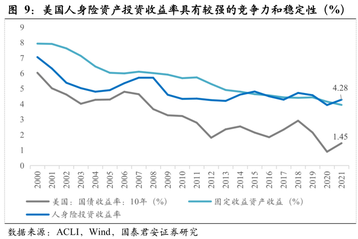 美国保险资管资金运用的投资收益具有竞争力。在长端利率下行周期,美国人身险资金运用的投资收益率仍然维持较强的稳定性,2021年美国人身险行业投资收益率为4.28%,高于固定收益类资产的投资收益率34bp,主要由权益和其他资产配置贡献带来。得益于拉长资产久期和适度的信用风险下沉,固收类资产的投资收益率长期优于十年期国债利率,2021年固收类资产投资收益率3.94%,高于10年期国债利率283bp。