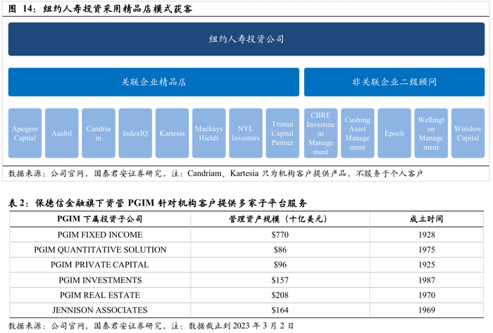 投顾团队主动获客,为机构客户提供财富管理配置方案。以美国保德信金融为例,旗下资管子公司PGIM整体依赖机构咨询与解决方案(IAS)团队进行客户研究,提供6家子平台的产品配置和选择方案,再交由各子平台联系客户并直接为客户进行相应产品的资产配置。