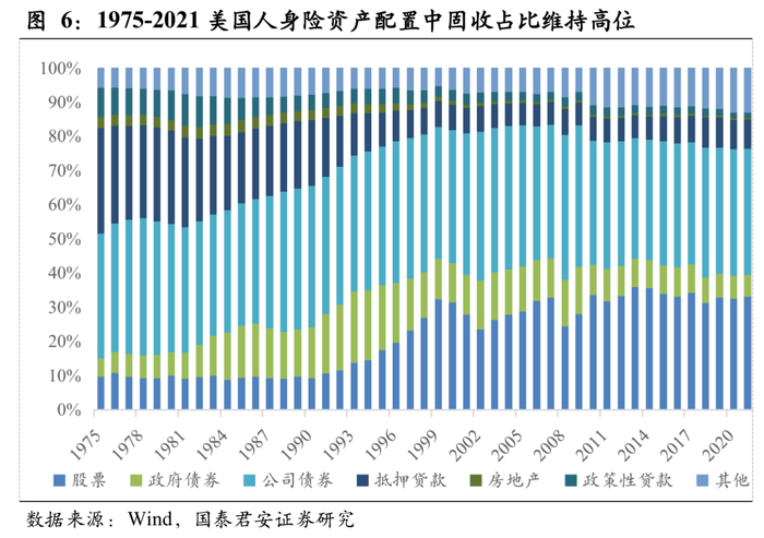 基于负债端不同账户匹配差异化的大类资产配置方案。保险产品分为传统险、分红险、万能险、投连险等多种形态,其中传统险受制于给付客户确定的保证收益,因此在资产配置方面有更高的安全性需求,而万能险和投连险等产品一定程度上将投资风险转移消费者,在资产配置中可承受更高的风险,因此资产配置的限制也比较少。基于此美国的投资账户分为一般账户和独立账户。一般账户支持有担保的、固定美元支付的合同义务,如寿险保单;独立账户支持与投资风险转移产品或业务线相关的负债,如变额年金、变额寿险和养老金产品。从管理资产规模看,一般账户高于独立账户,但独立账户的增速更快。截至2021年末,独立账户资产总计为3.3万亿美元,同比8.5%;一般账户资产达到5.3万亿美元,同比5.1%。其中,一般账户主要配置国债、政府债、企业债、MBS 以及抵押贷款等低风险资产;而独立账户则大量投资于股票类资产。2021年,人身险一般账户中,有66%投资于债券类产品,为减少不确定性,一般账户只有3%的权益类占比;而独立账户仅有16%的债券配置,76%的股票资产配置来获得较高收益。