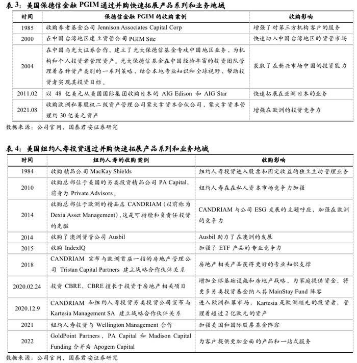发挥保险长期资金的优势,通过兼并收购维持稳健的投资收益水平及持续的收入增长。在长端利率长期下行以及人身险步入成熟期后增长放缓的背景下,美国保险资管公司为维持稳健的投资收益水平以及持续的收入增长,积极发挥保险长期资金的优势进行大量的兼并收购,拓展资产配置地域的同时多元化产品类别。一方面,美国保险资管公司通过兼并收购直接获取被收购公司的特定资产投资能力,丰富产品类别。由于长期利率走势下行,保险资管公司难以通过擅长的固收类资产的收益支撑负债成本和客户的投资回报预期,通过收购拓展产品种类有利于迅速提升在细分资产领域的专业能力,从而满足客户的多元化配置需求。例如,PGIM通过收购大型独立资管公司Jennison Associates Capital Corporation来提升其权益和固收主动配置的专业能力;PGIM通过收购Montana Capital Partners来增强另类产品的投资能力。另一方面,美国国内的长期低利率使得美国保险资管公司放眼全球,进行大量的全球化资产管理能力的布局,通过收购海外资管公司以及与海外具备一定规模的资管公司达成合作的方式快速融入当地市场,扩大市场份额,充分发挥属地优势。例如,纽约人寿在2014年收购总部位于欧洲的精品店CANDRIAM,作为多专业资产管理公司CANDRIAM是ESG领域的全球领导者,管理着超过100十亿欧元的ESG相关资产,在ESG产品线上扩充了30多种可持续战略产品,提供创新和多元化的投资解决方案,包括固定收益、股票等,涵盖所有资产类别,助力纽约人寿扩展全球市场;同年收购澳洲资管公司Ausbil,提升了公司主动管理的能力,权益类产品配置改善,提高绩效的同时有效管理风险。