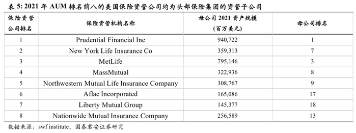 头部保险集团公司的保险资金贡献了头部保险资管较大的AUM。保险母公司以集团内资金促进保险资管公司的内生性增长。美国排名前8的保险资管公司的母公司都是美国资产规模和收入最大的20家保险公司,母公司的集团内部资金推动保险资管的管理资产规模快速扩张,同时奠定了有力的竞争格局。