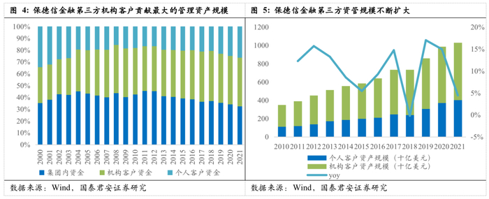 保险集团资金是美国保险资管机构的底盘,机构客户成为第三方资金的主要贡献来源。美国保险资管机构的管理资产规模构成中,保险集团内的负债资金是底盘,然而近年来美国保险行业进入成熟发展期保费增速有所放缓,保险资管机构管理资产规模的增长主要由第三方增量资金推动,其中机构客户的第三方资金增长尤为明显。以美国保德信金融为 例,第三方资管规模由2000年的2,025亿美元提升至2021年的10,308亿美元,在管理资产规模中的占比由64.8%提升至67.7%,其中第三方机构客户占比41.3%,第三方个人客户占比26.3%,机构客户成为第三方资金的主要贡献来源。