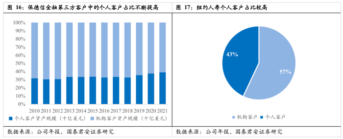 个人客户是美国保险资管机构的重点服务对象,是提升保险资管公司管理资产规模的重要方向。保德信金融的第三方管理资产规模中,个人客户的占比逐年提升,由2010年的31.8%提升至2021年的38.9%。纽约人寿同样注重个人客户拓展,2021年个人客户占比达到43%,通过个性化的产品设计满足个人客户的需求。