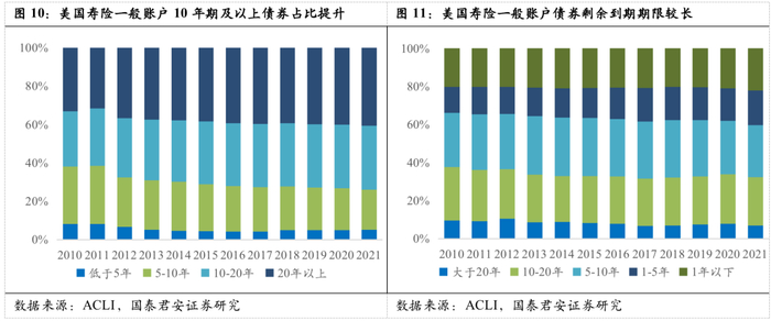 美国保险资管通过拉长资产久期实现资产负债久期匹配,降低利率风险。2010-2021年,10-20年期债券占比从28.8%提升至33.2%,20年期及以上超长期限债券的占比从33.1%提升至40.7%。