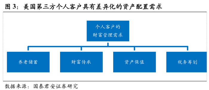 美国保险资管机构满足第三方个人客户多元化的财富管理需求。美国保险资管公司主要满足第三方个人客户的财富管理需求,包括长期养老储蓄、资产保值增值、税务筹划、财富传承等。