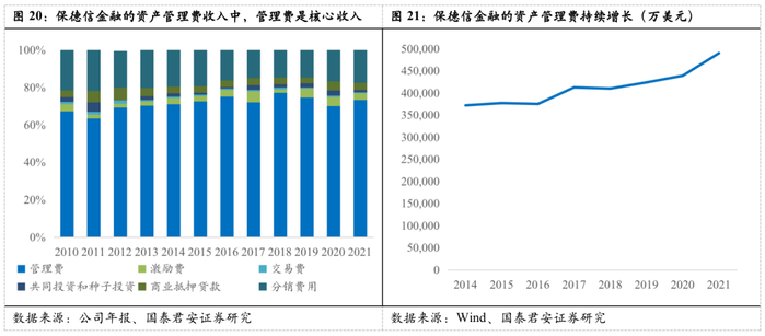 管理费用是保险资管收入的主要来源,第三方业务快速增长推动AUM和管理费率齐升。美国保险资管的收入主要包括管理费用、业绩报酬、产品分销费用等,其中管理费用是营收主要来源。第三方业务快速增长是驱动管理费用增长的主要因素,一方面在美国寿险保费增速趋势放缓背景下,第三方资金增长成为AUM增长的主要动能;另一方面第三方业务管理费率高于集团内资金管理费率,业务结构调整有利于提升管理费率。