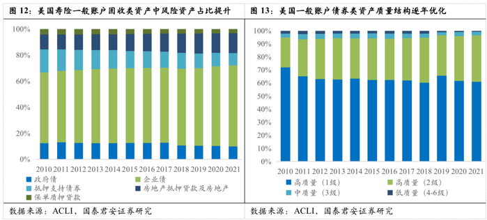 美国保险资管适度增加信用风险敞口,获取信用溢价。2010-2021年,美国一般账户固定收益类资产中,企业债占比从2010年54.3%提升至2021年62.2%;房屋抵押贷款及房地产占比从11.4%提升至15.3%。在保证风险可控的情况下适度调节资产质量结构,尽可能获得较高信用溢价。一般账户在长期维持高质量债券的配置比例90%以上的前提下,适当降低高质量(1级)债券占比,由2010年的72.0%下降至2021年的60.9%;同时提升高质量(2级)债券占比,由2010年的22.8%提升至2021年的35.6%,进一步获取信用利差。