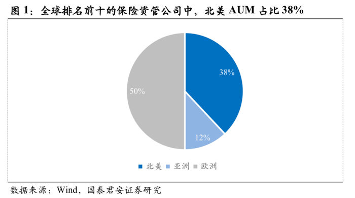 美国保险资管规模排名世界第二。北美地区保险资管业务发展成熟,规模排名全球第二,仅次于欧洲地区。在全球排名前十的保险资管公司中,欧洲保险资管公司的管理资产规模达50%,美国38%,亚洲12%。