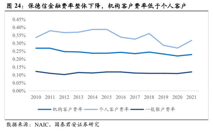 保险资管管理费率低于公募基金,加大第三方业务有利于提升管理费率。美国保险资管公司的费率维持较低水平,通常在每月或每季度末收取,根据提供的不同产品,针对的不同群体,设计不同的管理费用。根据美国保德信金融的数据,保险一般账户的费率最低,长期维持在0.1%左右;机构客户的费率维持在0.23%-0.27%之间;零售客户的费率最高,但近几年呈现下行的趋势。相较而言,2021年美国股票型基金、混合型基金和债券型基金的费率分别为0.47%、0.57%和0.39%,均高于保险资管的费率。近年来美国保险资管公司通过加大第三方业务的开拓力度来提升整体保险资管的而管理费率。