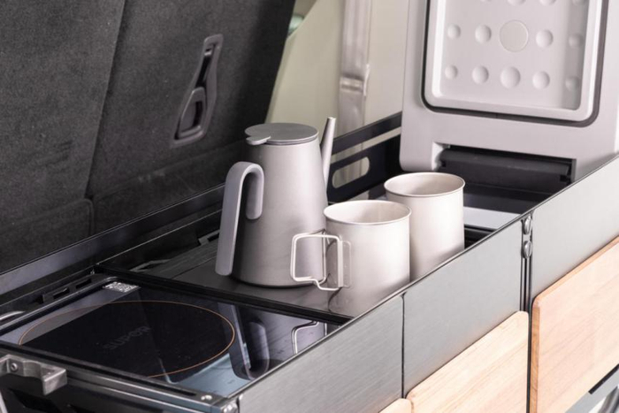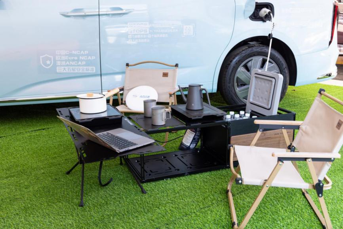 拥有“露营升级包”加持的大家 9,堪称“纯电露营MPV天花板”。“魔盒”由三个灵活模块组成,可根据家庭成员实际需求进行个性化定制开发。例如可选择冰箱、电磁炉、电热水壶三个模块,满足露营场景下“炊、饮、保鲜”基本需求。基于模块化和轻量化材质设计,“魔盒”本体重量仅8kg,几乎照顾到了家庭里每位成员的使用。同时,基于原厂定制优势,“魔盒”自带卡扣,能够和车内第三排座椅滑轨精准贴合,实现无损安装。值得一提的是,将“魔盒”放置到后备箱里,其上部能继续堆叠帐篷和两个20寸行李箱,下部也能放置折叠椅、1L大容量矿泉水等物品;而移至露营区,其既可以变成0.43㎡的露营桌,也可以变成露营必备装备——露营推车,一盒多能。有了“魔盒”的加持,露营前的准备工作更加轻松便捷。随着后续大家 9“露营升级包”开启众筹计划,其也将满足更多使用需求、覆盖更多露营场景。