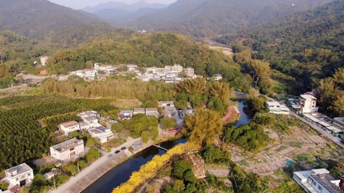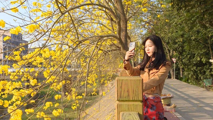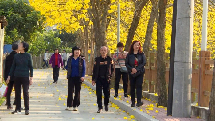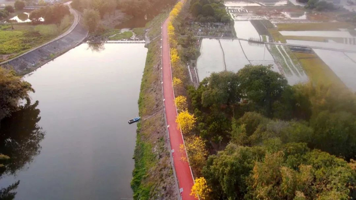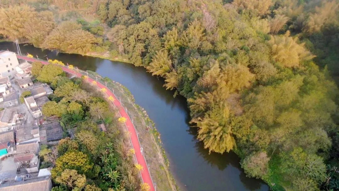 在已完成的8公里碧道,红色柏油路面平坦舒适,空中俯瞰犹如“红色丝带”灵动飘扬,多种花木点缀其间。最近恰逢黄花风铃木盛开时节,在河塘村的碧道上,满树繁花热烈灿烂,像是把金灿灿的黄色都揉进了春天里,带来生机勃勃的气息。