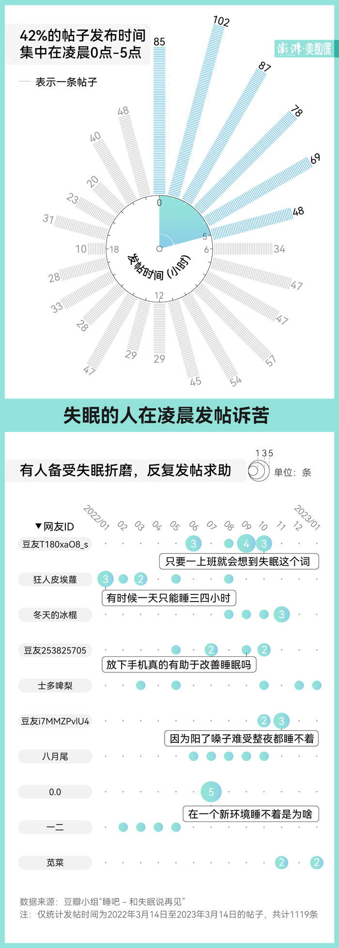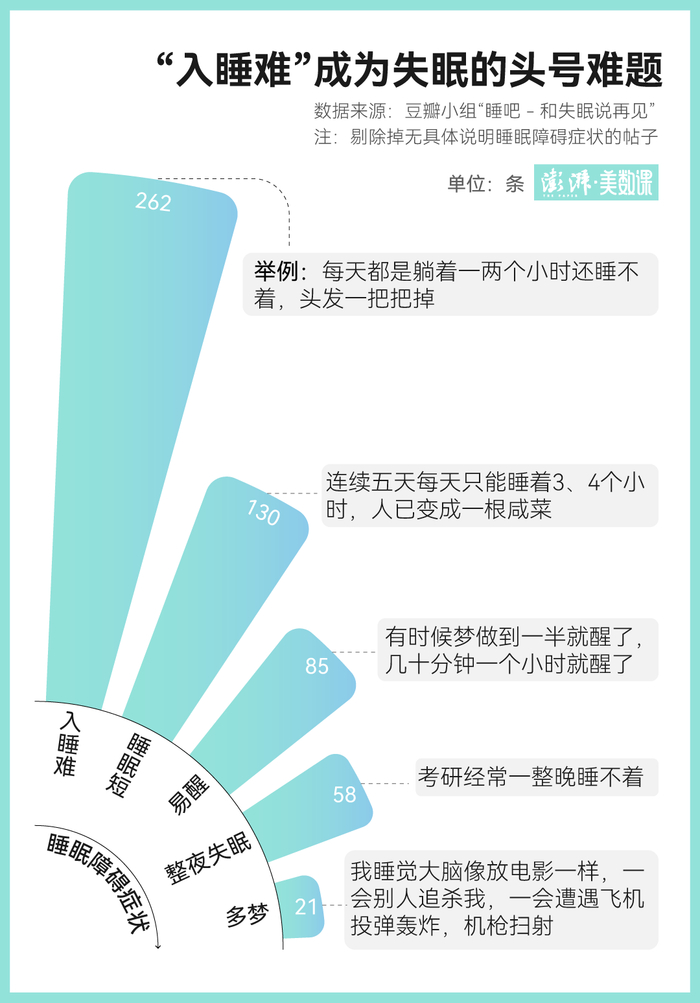 在豆瓣小组“睡吧 - 和失眠说再见”(下称“睡吧”),就聚集了 7 万多名深受失眠困扰的人。在该小组近一年内发布的帖子中,42% 的帖子发布时间集中在凌晨 0 点- 5 点,还有深受失眠困扰的人多次发帖求助,最长持续了一年。