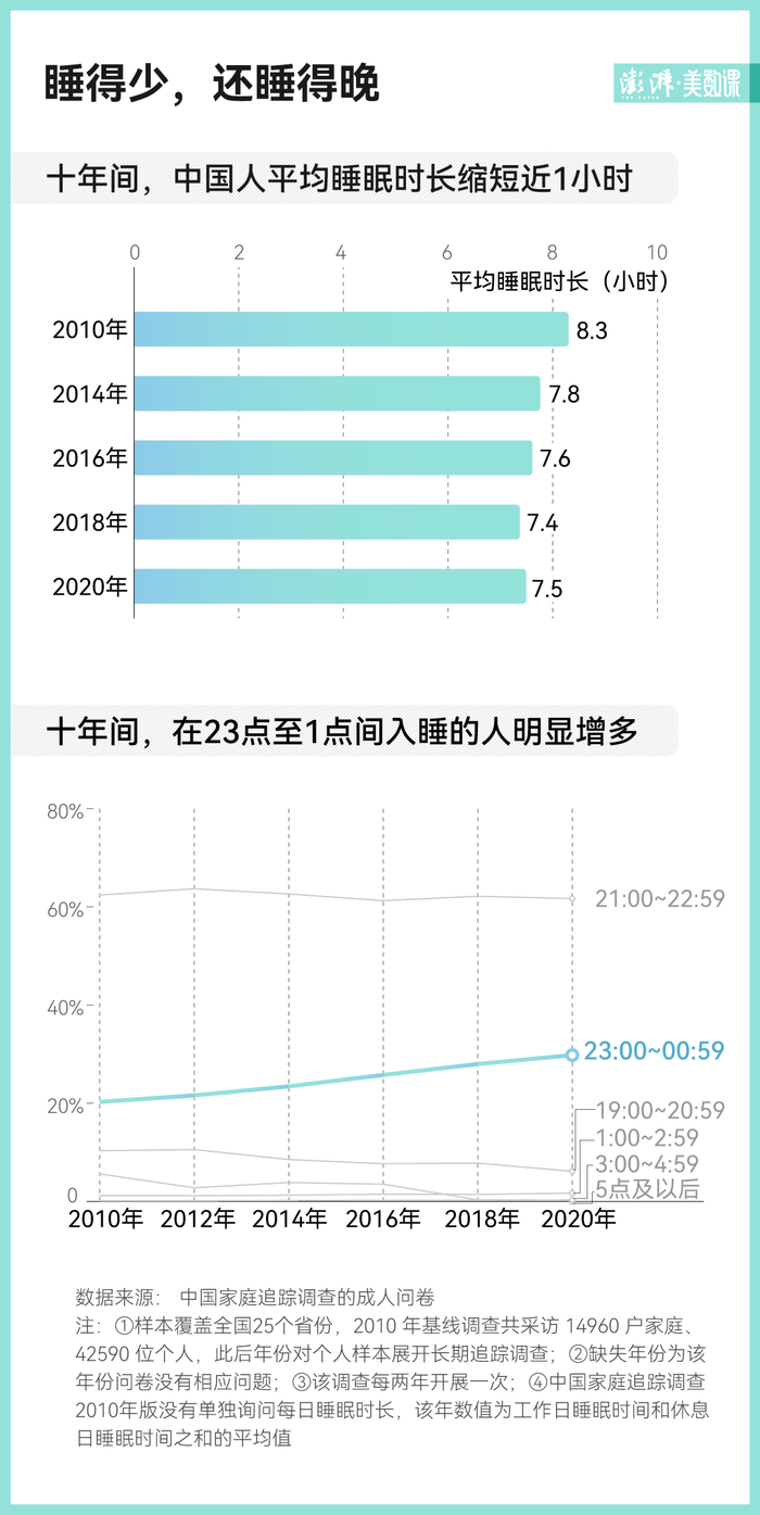 数据显示,从 2010 年至 2020 年,中国人的平均睡眠时长缩短了近 1 小时,从 8.3 小时减少至 7.5 小时。睡得越来越少是一方面,中国人还越来越晚睡了,在 23 点至 1 点间入睡的人明显增多。