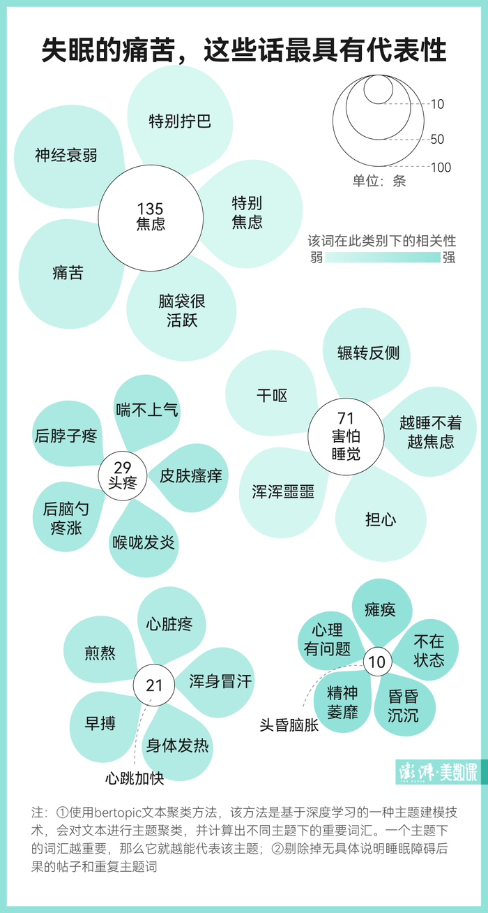 “越睡不着越焦虑”“喘不上气”“昏昏沉沉”……这些都是睡眠不足的后果。在“睡吧”,关于失眠的后果可以被分为五大类主题:焦虑、害怕睡觉、头疼、心跳加快和头昏脑胀。