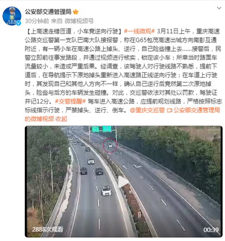 3月11日上午,重庆高速公路交巡警第一支队巴南大队接报警,称在G65包茂高速出城方向南彭互通附近,有一辆小车在高速公路上掉头、逆行,自己险些撞上去……接警后,民警立即前往事发路段,并通过视频进行核实,锁定该小车;所幸当时路面车流量较小,未造成严重后果。经调查,该驾驶人对行驶线路不熟悉,提前下道后,在导航提示下原地掉头重新进入高速路正线逆向行驶;在车道上行驶时,其发现自己和其他人方向不一样,确认自己逆行后竟然第二次原地掉头,险些与后方的车辆发生碰撞。对此,交巡警依法对其处以罚款,驾驶证并记12分。交警提醒:驾车进入高速公路,应提前规划线路,严格按照标志标线指示行驶,严禁掉头、逆行、倒车。
