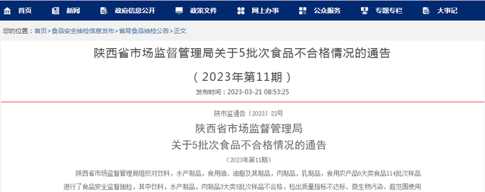 陕西省市场监管局关于5批次食品不合格情况的通告(2023年第11期)
