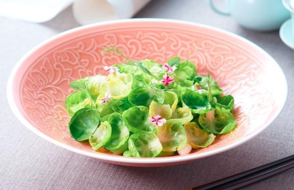新推出的“蚕豆白玉抱子甘蓝”,名字里有蚕豆,可盘子里却不见蚕豆。厨师长罗玉麟告诉记者,青嫩饱满的蚕豆藏在了小碗状的抱子甘蓝下。整道菜品看上去宛如豫园九曲桥边的一池青青荷叶,是一道“小清新”。