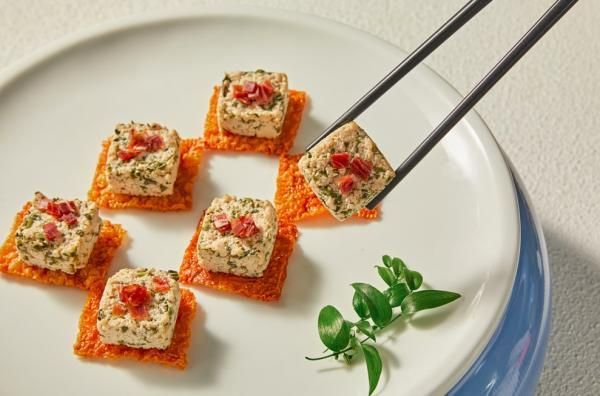 上海德兴馆也拿香椿做文章:香椿搭配老豆腐和火腿,不仅摆盘好看,口味也独树一帜。上海德兴馆品牌总厨、复兴荟店厨师长梅林介绍,这道“金腿香椿拌豆腐”制作起来,要比一般的凉菜费功夫。香椿芽在焯水后切成细末,再与碾碎的老豆腐充分拌匀,然后压制成大小一致的方块,置于炸好的金黄豆衣“底座”上,最后洒上少许火腿丁增色。上桌后,这一盘黄、白、红三色相间的创意新品,让不少食客举起了手机拍照。