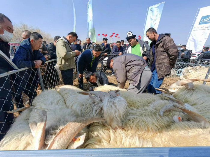 很多当地养殖户也牵来了自家的种羊到现场,准备卖个好价钱。盖州市高屯镇落水寨村的养羊大户金宪来告诉记者;“我家现在养了140多只绒山羊,一头羊能挣1000到5000元不等。从辽宁绒山羊原种场引进纯种3只公羊,今天带来一只,报价在一万元以上。”他说现在羊绒供不应求,种羊也供不应求。
