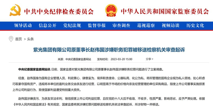 通报显示,赵伟国涉嫌贪污、为亲友非法牟利、背信损害上市公司利益犯罪。