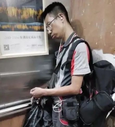 有人好心上前提醒他,才发现他早已靠在角落睡着了。
