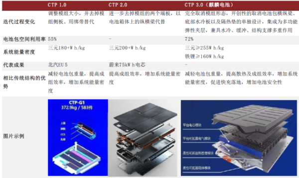 麒麟电池的水冷板设计。资料来源:国家知识产权局,中金公司研究部;注:专利公开号为CN216648494U,图中标红位置为加强体结构,水冷功能集成于加强体之中由于麒麟电池可实现全化学体系的热稳定、热安全,从而适配更高能量密度的材料升级。去年11月1日,装载麒麟电池的极氪009上市。据宁德时代国内乘用车执行总裁刘畅延当时介绍,极氪009ME版装载的麒麟电池使用了全球首款高镍正极、硅基负极的高比能电芯。此外,极氪009的麒麟电池使用了快离子环、超电子网和超导电解液,并提高了散热能力,从而克服了以往电池快充的瓶颈。“在不堆电池的情况下,极氪009ME版以140度电,创造了中大型MPV 822公里的纯电续航全球纪录。”刘畅延说。结构创新引领未来电池技术趋势据中金公司分析,目前来看,动力电池向无模组、集成化方向发展将成为未来电池技术的趋势,是电芯品质提升后对能量密度追求的必然选择。电动车为提升续航里程,需在有限的底盘空间内提升体积利用率,尽可能多地放置动力电池以增加实际带电量。同时,CTP等无模组化技术也有助于电池降本并推动标准化与换电等新商业模式推广。据介绍,除了宁德时代的CTP技术(直接将电芯集成在电池包上,但保留电池托盘、上盖板的设计),电池系统集成的技术趋势还包括CTB(Cell to Body)、MTC(Module to Chassis)、CTC(Cell to Chassis)等。其中,CTB的代表是比亚迪。比亚迪2022年5月推出CTB方案,率先应用于海鸥车型。该方案将刀片电池的上盖与车身底板集成于一体,取消了单独的上盖板设计,但仍保留电池托盘。方案将电池包空间利用率进一步提升至66%、能量密度提升10%。MTC的代表企业是零跑。零跑于2022年4月推出MTC方案,保留了模组和电池托盘设计,将车身底盘作为电池包上壳体、取消了单独的上壳体,让零部件数量减少20%、电池布置空间增加14.5%。CTC的代表企业是特斯拉。特斯拉在2020年推出基于4680圆柱电池的CTC方案,方案直接将圆柱电芯排列在车身上形成电池舱、前后连接车身大型铸件,电池上盖代替车身地板,可减重10%,增加14%的续航以及降低7%的成本。