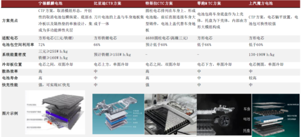 资料来源:宁德时代官网,特斯拉官网,比亚迪官网,领跑官网,上汽集团官网,中金公司研究部中金公司认为,综合对比各家CTP和CTC方案,宁德时代麒麟电池和特斯拉的4680CTC的冷却效果、散热性能、电池寿命更优,但特斯拉4680CTC方案,由于采用大圆柱形电芯,考虑到圆柱排列天然存在间隙、成组效率低于方形,系统能量密度较麒麟电池略低。而近日宁德时代在回答投资者调研提问时,再次表现了对麒麟电池技术的自信。公司表示,“整体来看,(相较于大圆柱形电池),我们认为方形+麒麟电池方案更优,体积利用率、能量密度都比较高,其优秀的热管理设计可以搭载更先进的快充电池。”