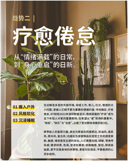 小家扩容,不只是满足小户型功能的五脏俱全,而是不断向内的空间扩容、功能扩容、氛围扩容。随着前往人流密集区习惯的改变,人们已习惯居家办公、居家娱乐、居家欢聚,也因此提出了更多开发专属新角落的需求。以年轻人热衷的电竞为例,其是许多男性工作忙碌一天后放空自我的“精神食粮”,2022年京东电竞桌成交额同比增长近9倍,电竞房装修同比增长超 3倍。越来越多人注重打造健康舒适的居家办公学习空间,2022年京东落地护眼灯成交额同比增长超10倍,人体工学椅同比增长90%。