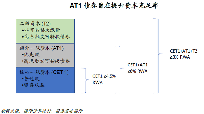 额外一级资本债券(AT1)是或有可转换债券(Contingent Convertible Bonds, CoCo Bonds)的一种。AT1是在全球金融危机之后首次推出的,旨在防止危机在金融部门蔓延,在危机时期充当银行资本的直接来源,即被用于在银行面临破产时承担损失,从而减轻政府和纳税人的财政负担。