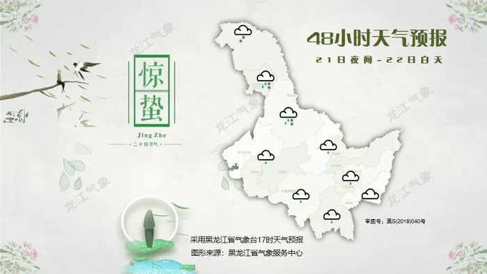 21日夜间到22日白天:大兴安岭北部阴有小雪,大兴安岭南部、黑河多云有雨夹雪,鸡西多云,其它地区多云有阵雨。