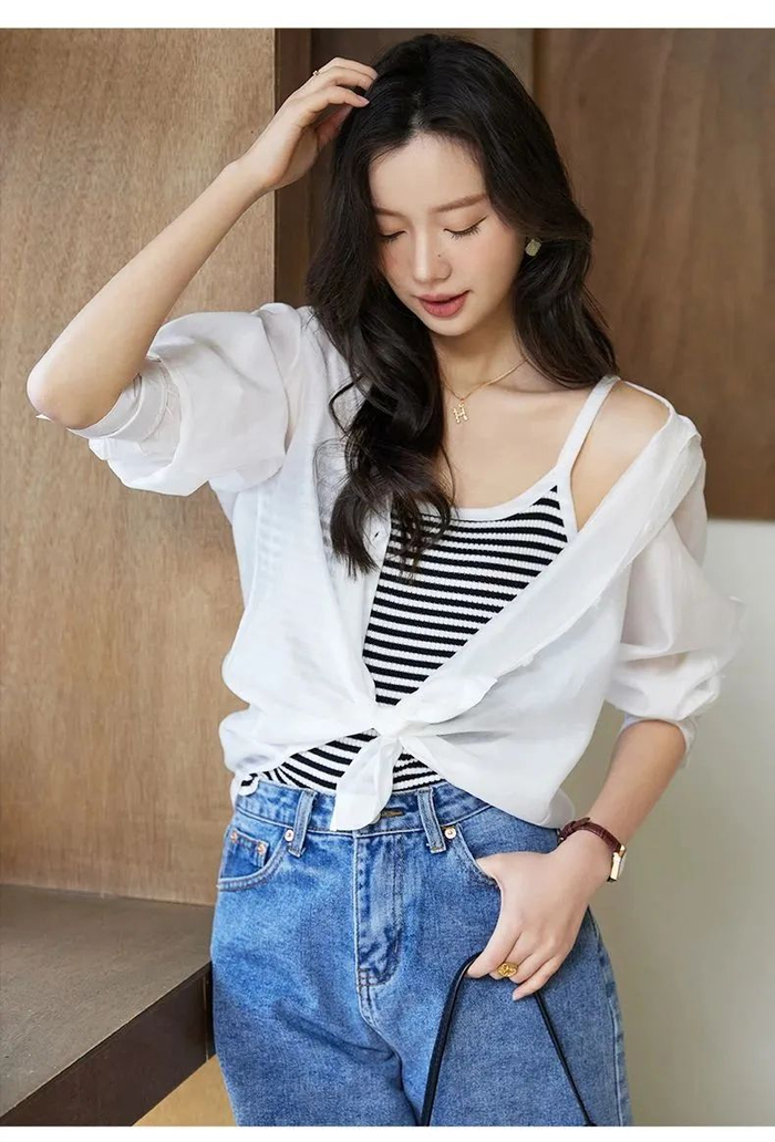 也可以做为防晒外搭, 把衣角打个结,瞬间就能突出腰线~